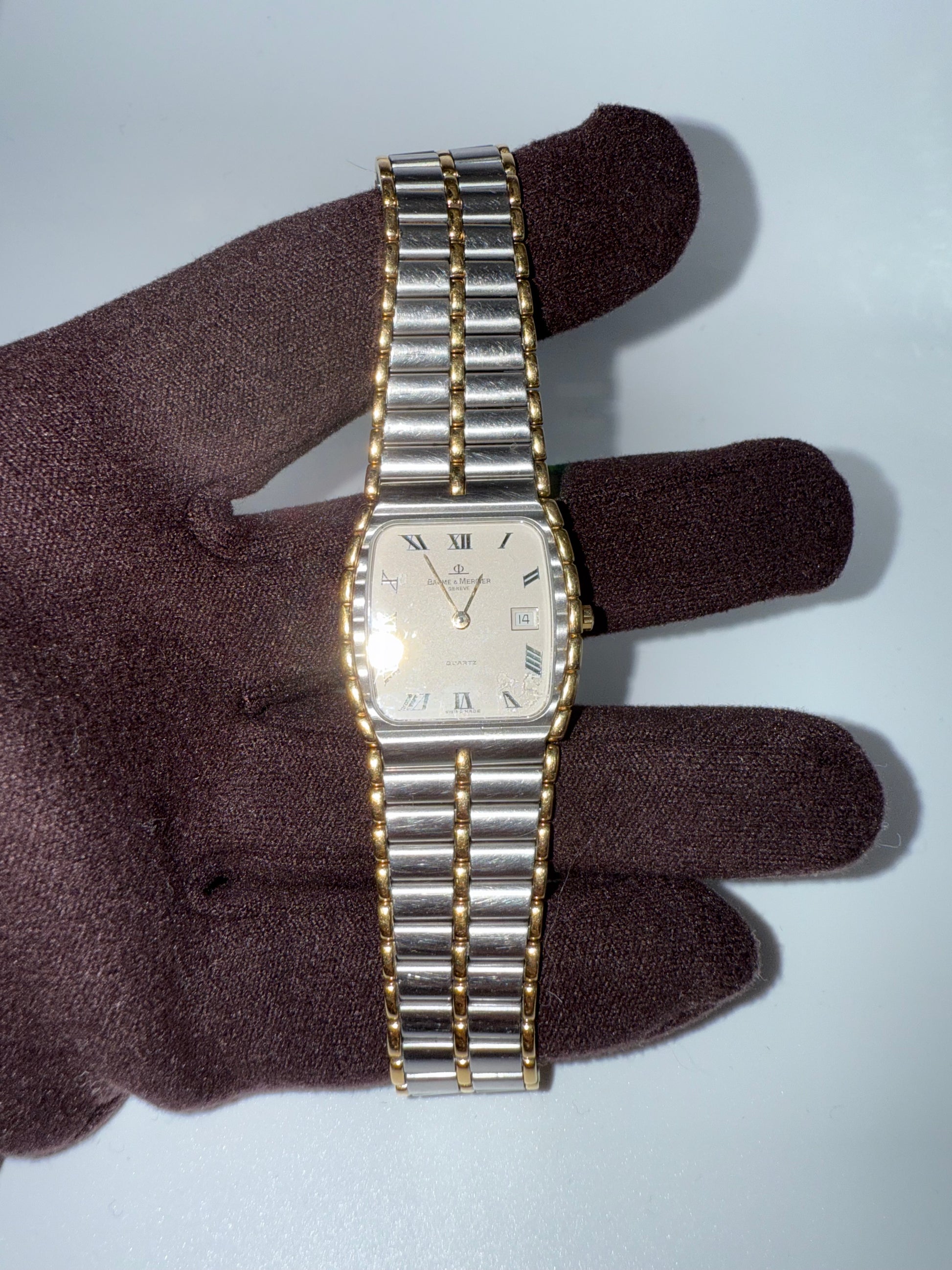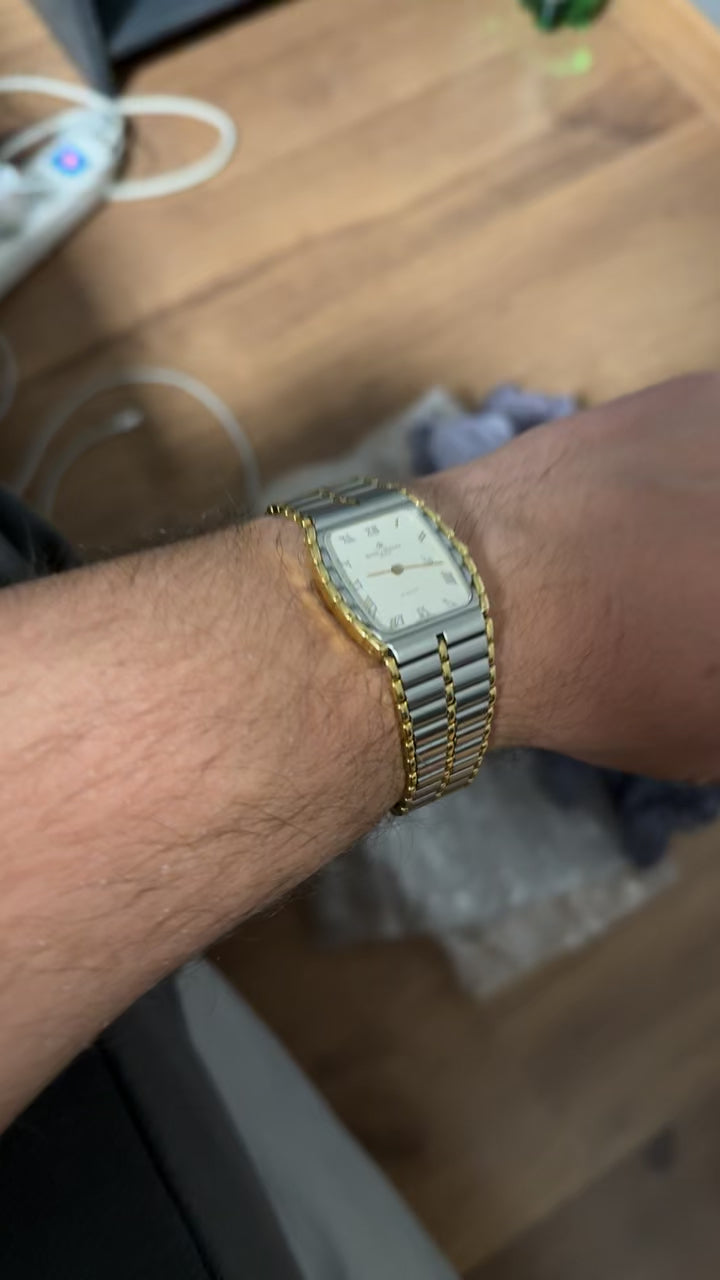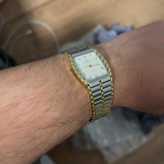 Symbole du raffinement des années 1980-1990, cette Baume & Mercier réf. 5750 incarne l’élégance intemporelle à la suisse. Son boîtier rectangulaire bicolore acier et plaqué or, associé à un bracelet intégré assorti, en fait une pièce à la fois chic et discrète, parfaite pour un usage quotidien ou habillé.